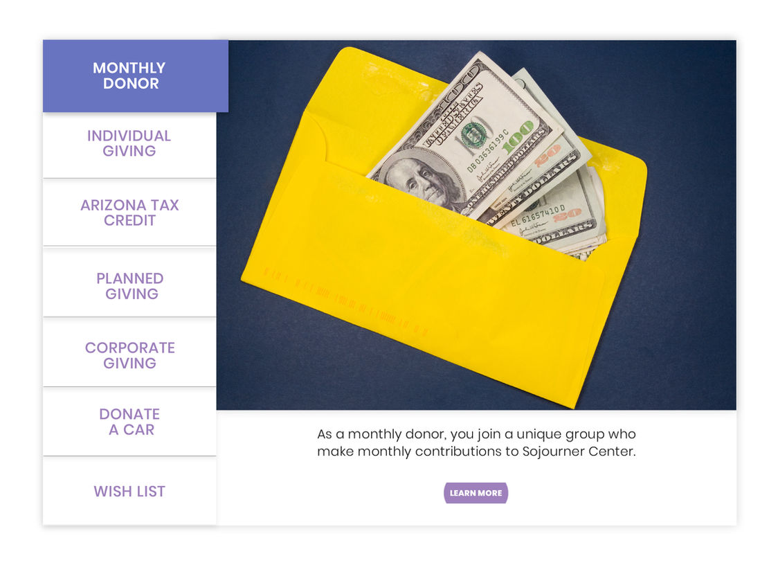 Sojourner Center is a safe haven from domestic violence for women and their children in Arizona. They came to our company needing a new site that streamlined the process of getting help and resources. I created a modern layout and design that conveyed information quickly.